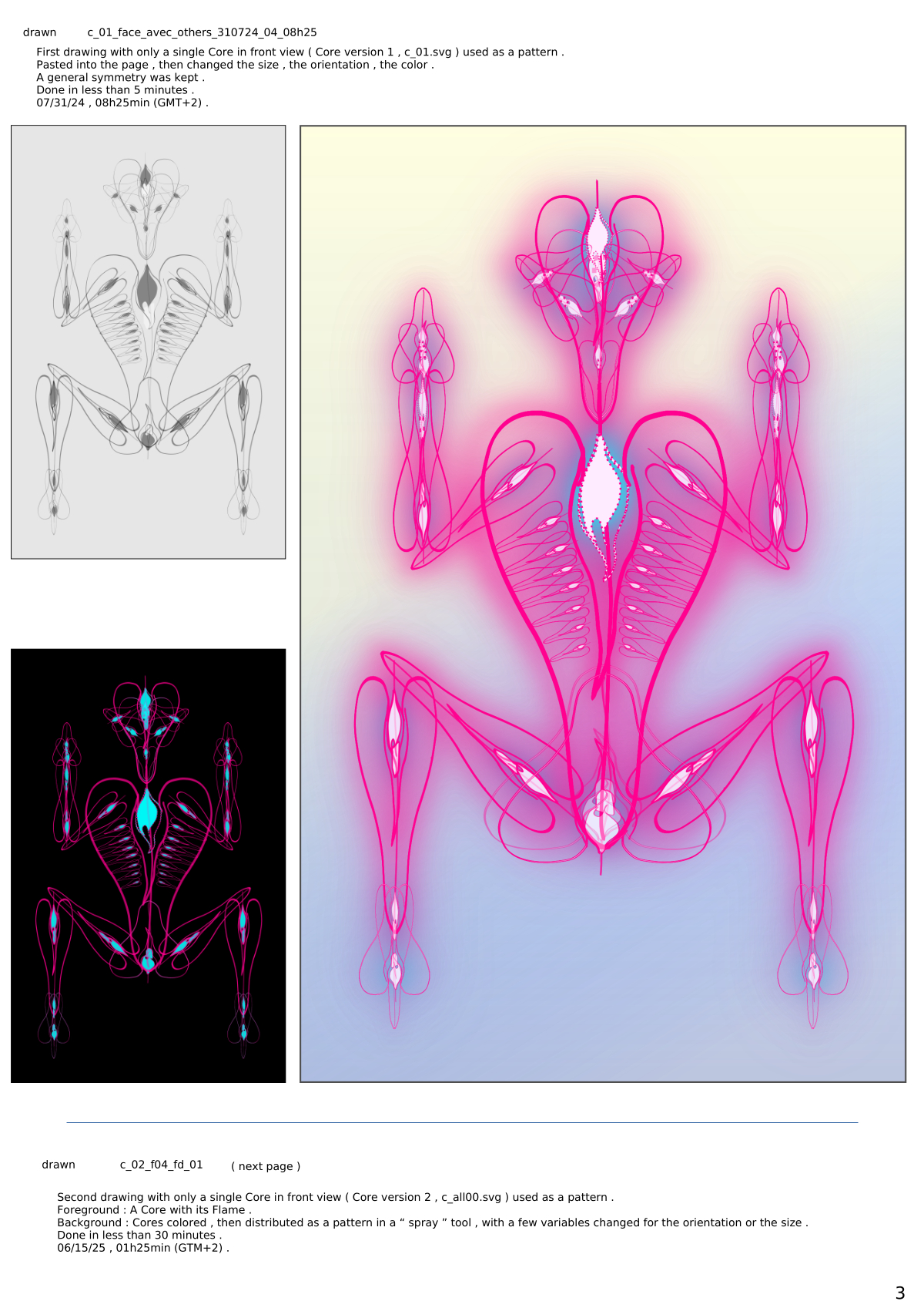 A tile for a tileable texture. To do some 2 branch galaxies, and some nicer swasticas . It even has two right angles , the square´s lover will like it a lot. The fan of the vampire movie ´´Blade´´ too ... And concerning Escher ... that one he had not found , and for what he have done with these tiles, I would not have liked that he found it. The last line is its evolving with the Cores ( in lateral view, wrongly proportionated here . July 2025 , 01:25am
